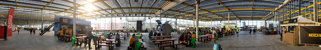 Entlang der Halle kamen wir schnell zur großzügigen Anmeldung und in den Eventbereich [Fotos siehe oben], der schon in der Halle beeindruckend groß war. Linke Hand befand sich der Zieleinlauf, dahinter eine große, sehr große Fress-/ Getränkemeile, mittig Sitzgelegenheiten ohne Ende und drum herum diverse Stände.