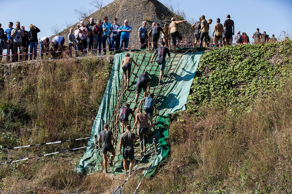 Unten in der Galerie sind die einzigen für Zuschauer erreichbaren Lokationen außer dem Eventgelände zu sehen! Der Startbereich | nach einiger Zeit kamen die OCR-Läufer zum Wasserhindernis | danach mussten sie den Anstieg am Netz bewältigen und es ging zum letzten halbwegs einsehbaren Hindernis – die große Wall auf dem Weg zum höchsten Punkt des Laufes.