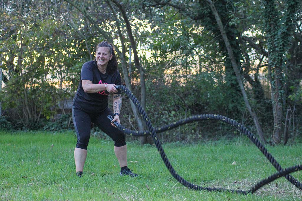Daneben haben wir natürlich noch viele andere Elemente wie verschiedene Reifen, Ropes, eine Slackline, verschiedene Gewichte vom Sandsack bis zur Gewichtsweste und vieles mehr.